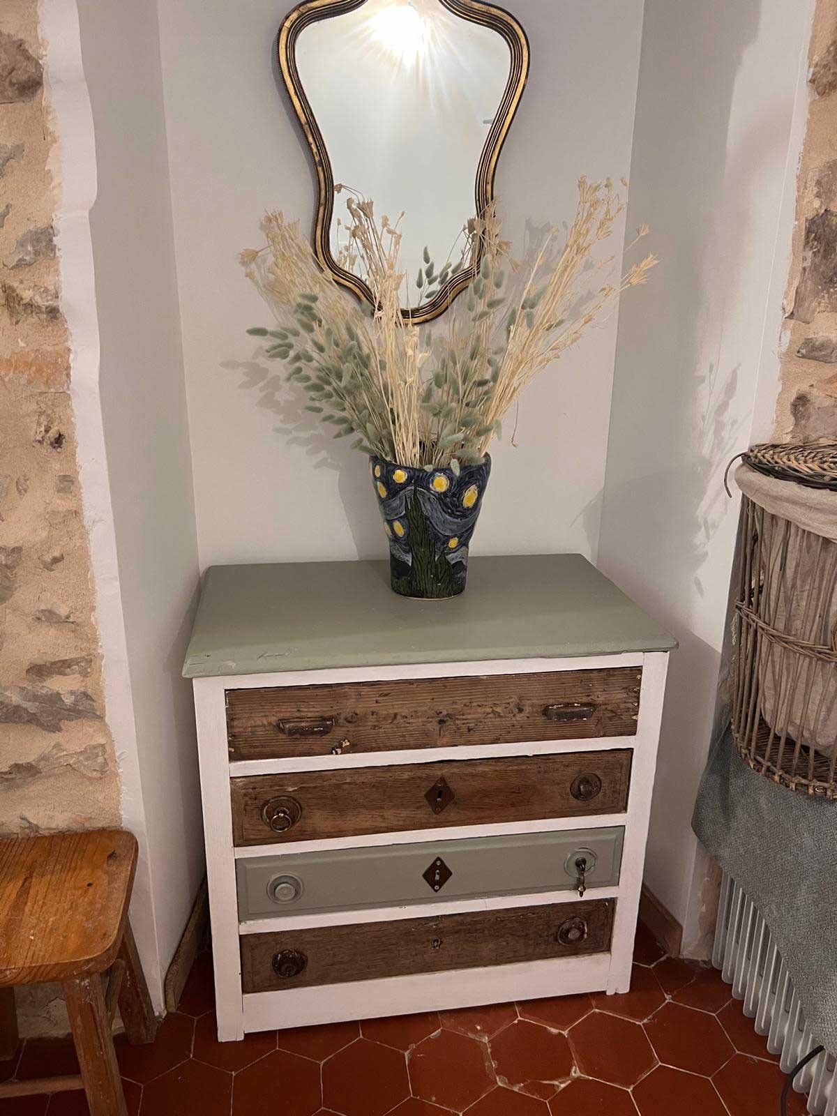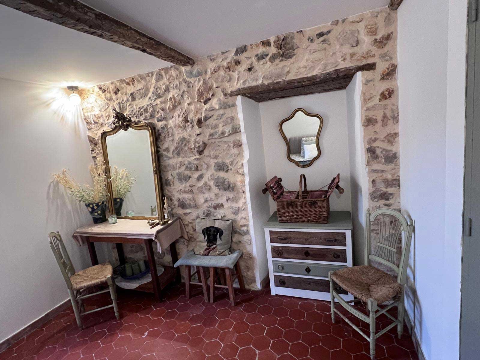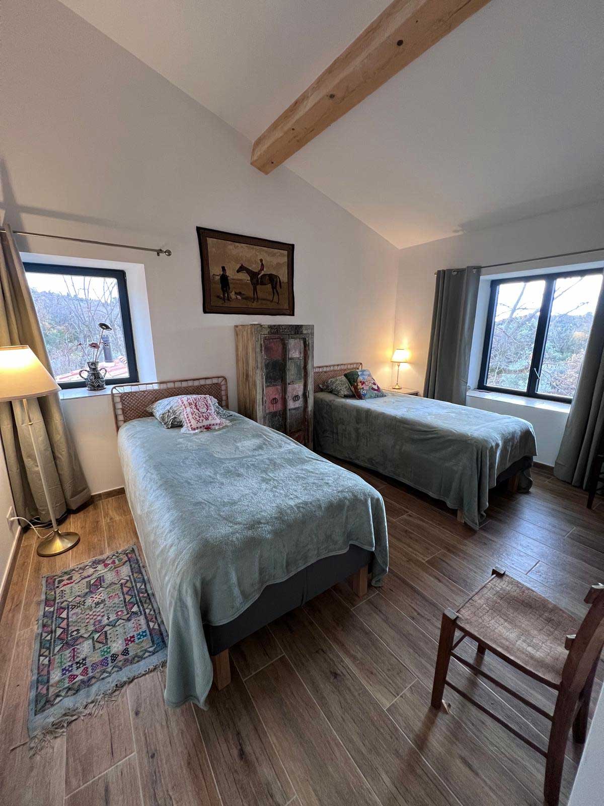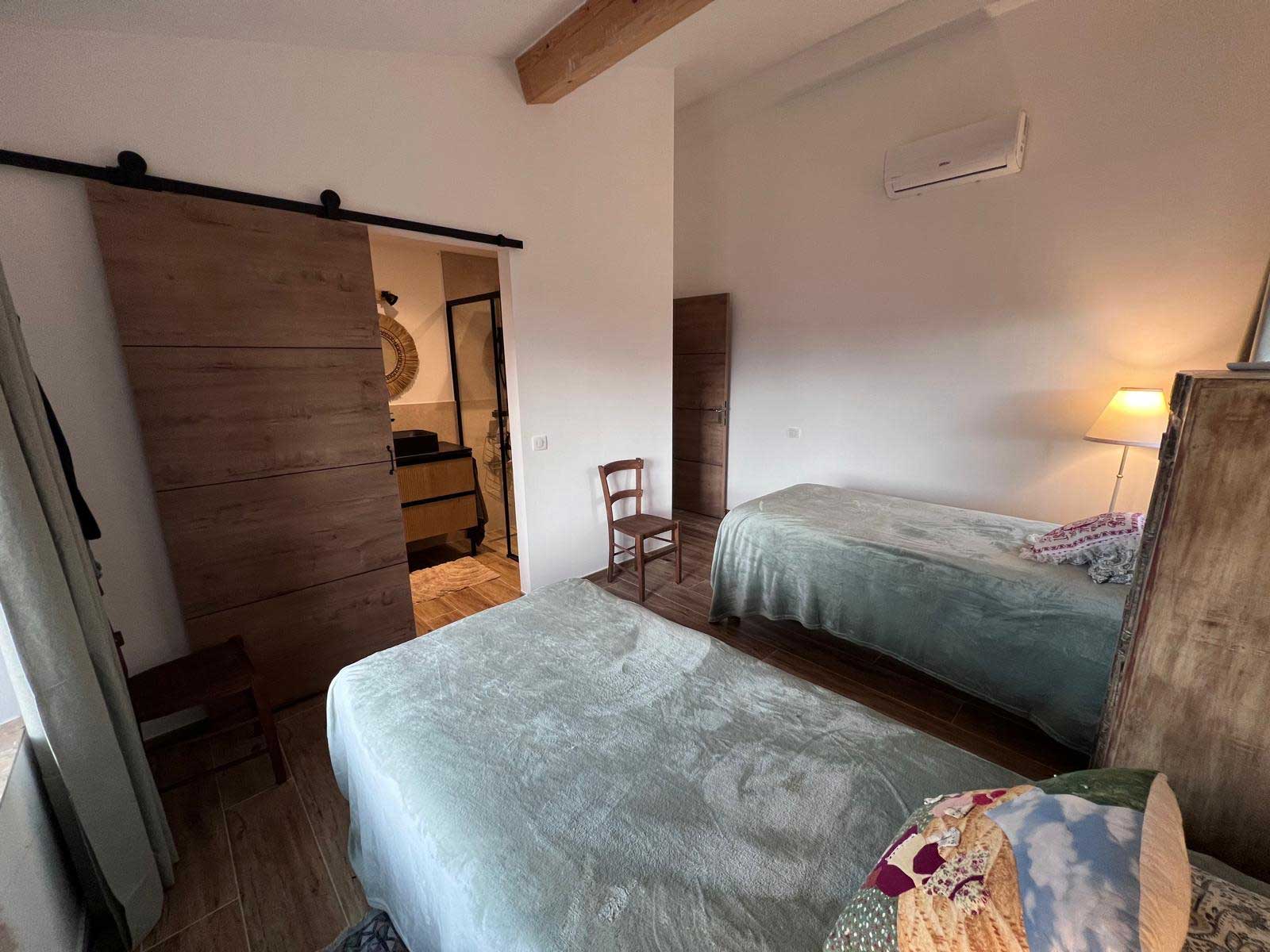 Chambre de 20 m² équipée de deux lits en 90. Elle dispose d’une salle de bain avec douche et WC, ainsi que de la climatisation pour un confort optimal. 3 chambres d’hôtes de charme – wifi inclus